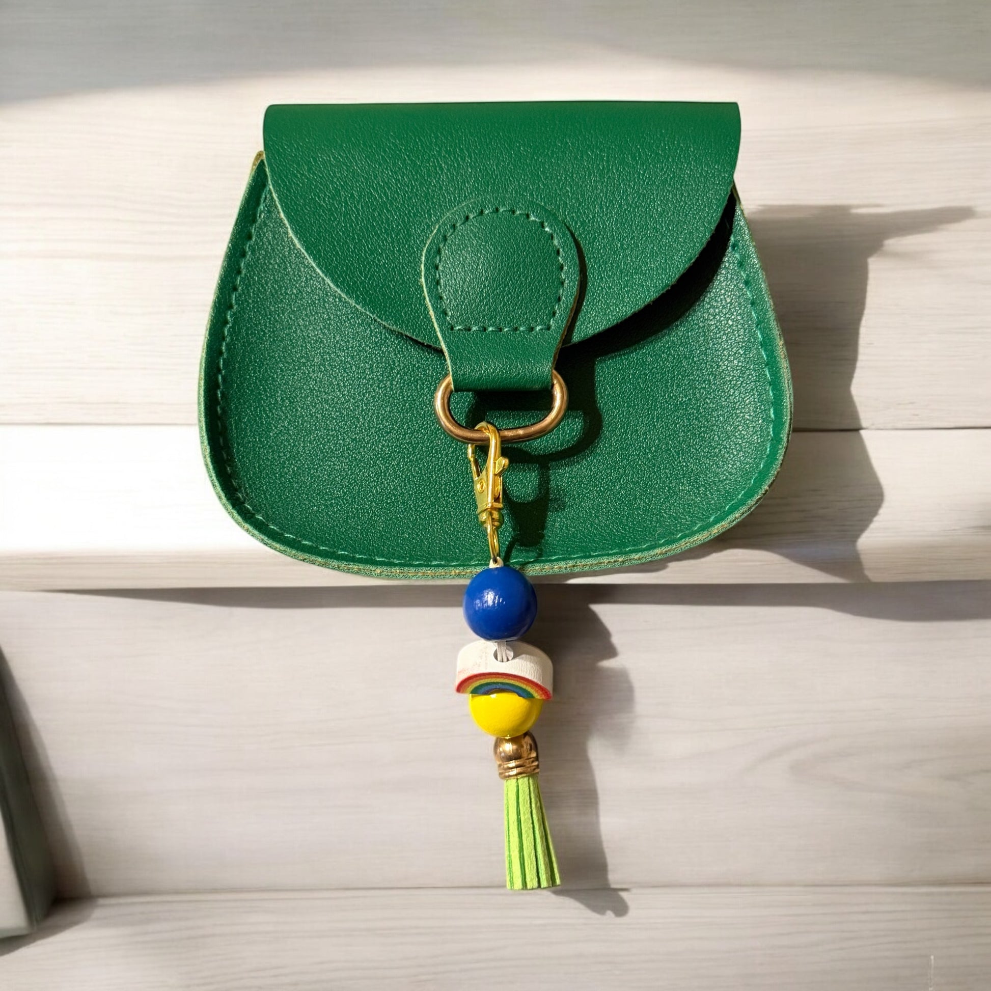Hand crafted purse charm features wooden beads and a secure lobster clip. Measuring 4.5 inches long, it adds a touch of color and cuteness to any bag.