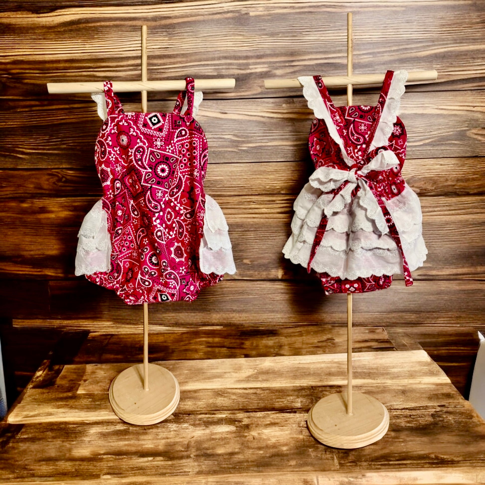 Handmade from 100% cotton, this ruffle romper features a cute pink bandanna print with cotton lace ruffle and adjustable tie sleeves. It is available in size 12/18m.