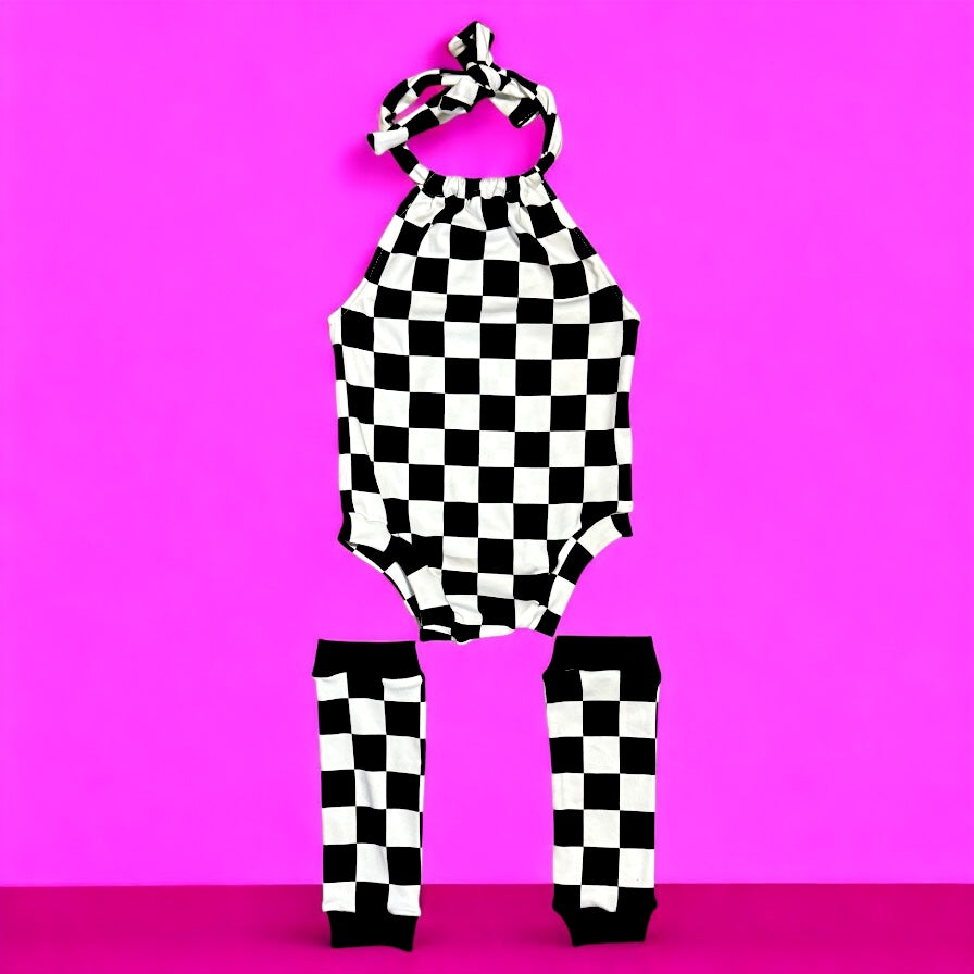 Handmade from a soft, flexible fabric, this halter onesie features adjustable neck tie. And matching leg warmers. It is available in size 12/18m.