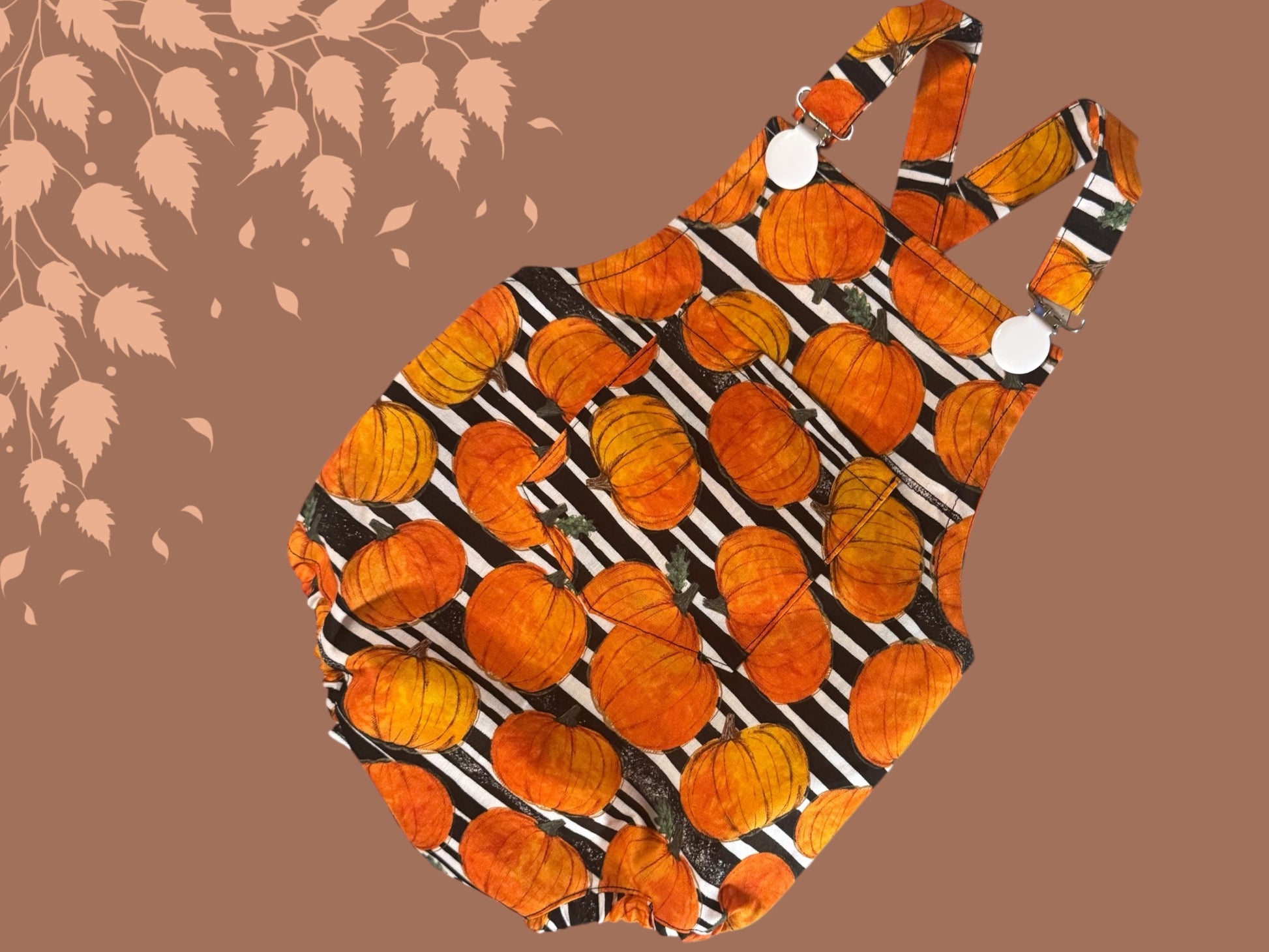 These cute pumpkin overalls are handmade from 100% cotton fabric with elastic leg band. Available in size 9/12m
