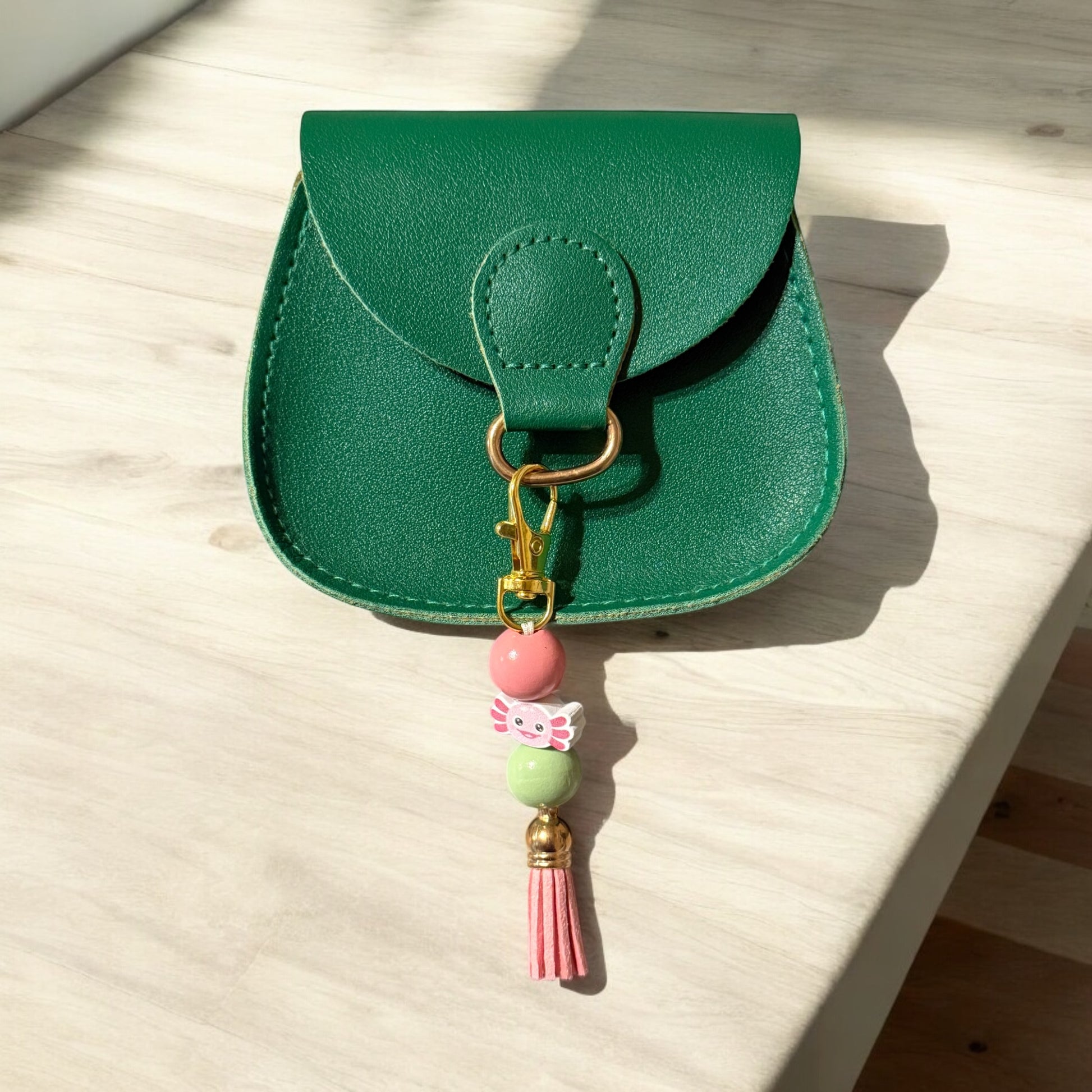 Hand crafted purse charm features wooden beads and a secure lobster clip. Measuring 4.5 inches long, it adds a touch of color and cuteness to any bag.